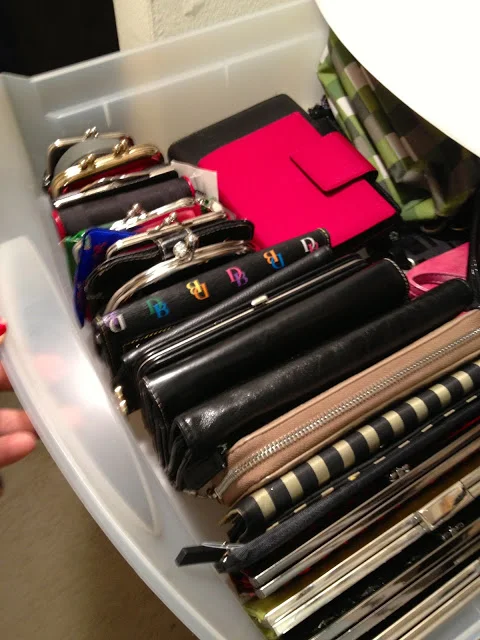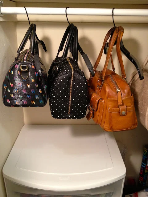 So you know I had to organize it! I was cleaning out our hallway closet the other day and accidentally stumbled upon this fabulous way of organizing my handbags. Maybe someone else has done this, I don't know, but I'm going to share it just the same!